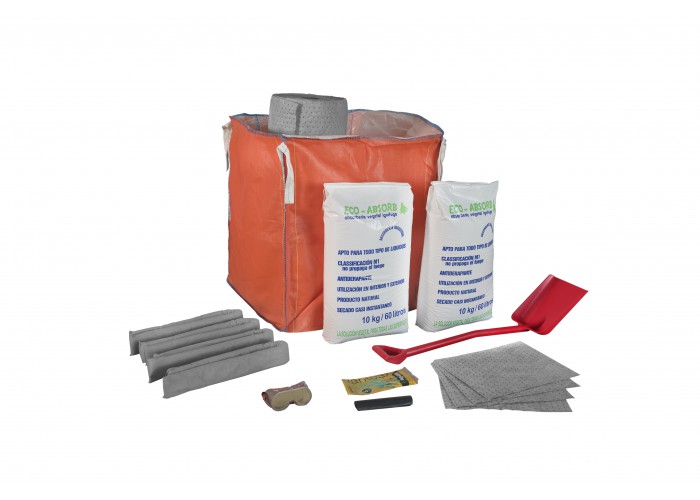 | Contenido | Gafas, guantes, 250 hojas, 50 barreras, 20 almohadas, 4 Rollos (50 cm x 40 m), 3 sacos de Eco-Absorb, 16 bolsas de residuos, 1 pala de plástico higiénica, hoja de instrucciones y 2 big-bags. |